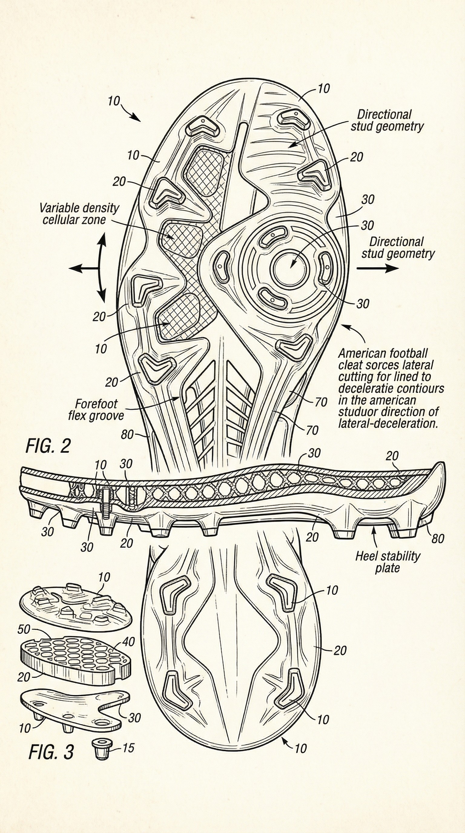 The work starts underfoot, analyzing how elite receivers load the ball of the foot during aggressive cuts. Film study, biomechanics data, and patent research converge on one critical zone: the forefoot plate and its role in medial to lateral force transfer during a hard plant.